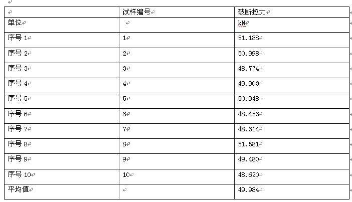 試驗方案:鋼絲帶破斷試驗機拉伸測試方案試驗速度:13 mm/min試驗日期:2013-03-29 15:30:25送檢單位:日立電梯試驗設備:CMT5305備 注:該鋼絲帶為橡膠與鋼絲線材的組合體,所用夾具為專用夾具,測試破斷最大力。用戶為三思泰捷老用戶單位,其QC檢測所用的試驗機多為三思泰捷設備,多年來保持良好的合作關系。鋼絲帶破斷試驗機拉伸測試數據及曲線: